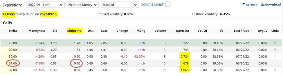 As an example, look at the out-of-the-money call options priced for Sept 16 expiration. The Barchart table below shows that the $31 strike price calls for expiration on Sept. 16 have an attractive 60 cents premium.